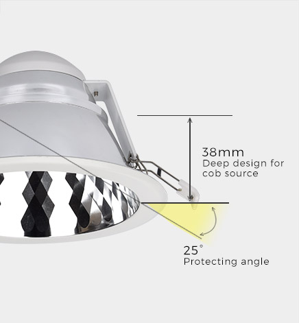 Soft light effect, deep design (38mm) for cob source, large shading Angle 25°, better anti-glare effect.